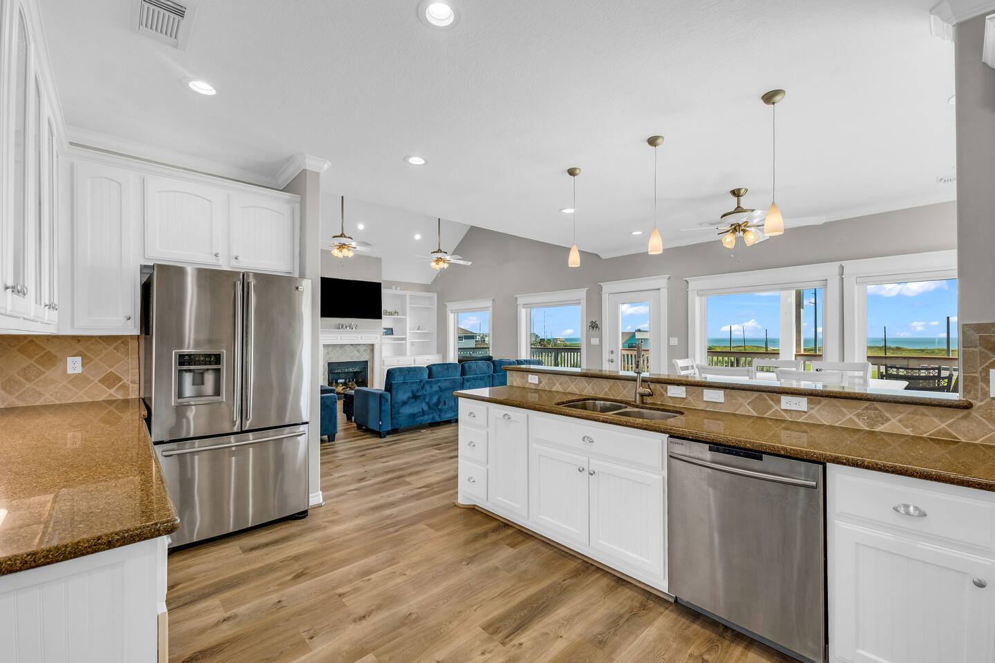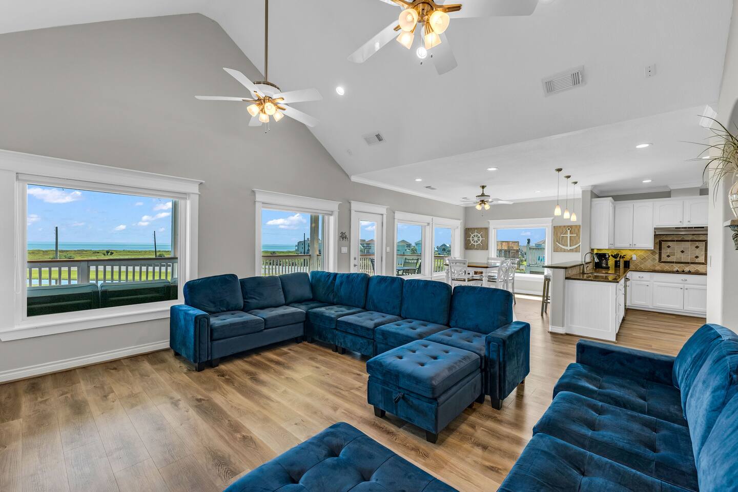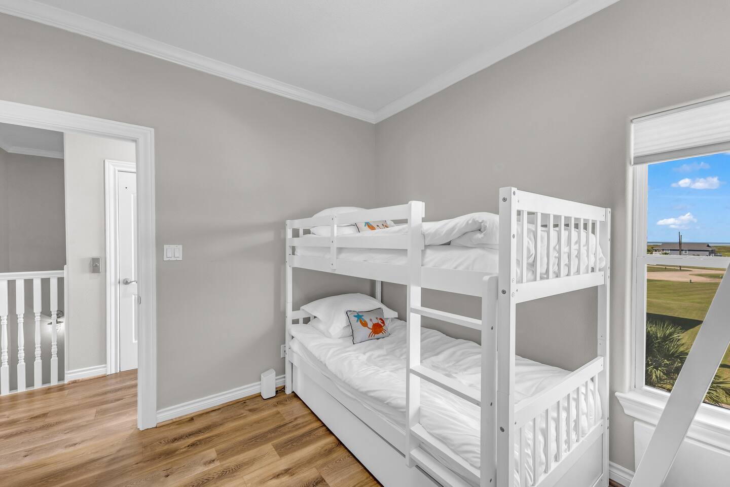 The Space Sea-renity is designed with your comfort and relaxation in mind. Its open living spaces are filled with natural light from large windows that showcase stunning views of both the Gulf and Bay. Whether you’re enjoying morning coffee on the balcony, hosting a family barbecue, or unwinding with loved ones, every corner of this home invites you to relax and recharge. What You’ll Love Prime Location & Beach Access Located in a quiet West End neighborhood, Sea-renity puts the sand and surf within easy reach. Drive in 2 minutes, walk in 10, or cruise through a private beach tunnel in a golf cart for effortless, safe access. Neighborhood Amenities Cool off at the community pool, featuring a toddler pool, outdoor shower, and a shaded gazebo with picnic tables—perfect for post-beach relaxation. Updated & Fully Equipped Past concerns about flooring and refrigerator issues have been fully resolved. You can now enjoy a modern, functional kitchen and safe, worry-free flooring throughout the home. Stunning Gulf Views Savor breathtaking ocean panoramas from the spacious balcony—ideal for morning coffee, sunset dining, or simply soaking in the view. Family and Pet-Friendly Sea-renity is perfect for family gatherings, trips with friends, and pet lovers! With space for everyone to relax and play, plus a pet-friendly policy for up to 2 pets, your entire family—including furry members—can join the fun. The Layout Second Floor: Bedroom 1: King bed with en-suite bath and crib Bedroom 2: King bed with shared bath access Bedroom 3: Queen bed with shared bath access Third Floor: Bedroom 4: Three cozy bunk beds—perfect for kids or extra guests Spacious living room and fully equipped kitchen, both with spectacular views—ideal for cooking, dining, and gathering together. Why Choose Sea-renity? Nestled in Galveston’s tranquil West End, Sea-renity combines convenience with serenity. With easy beach access, sweeping Gulf views, and all the comforts of home—including fully updated features—this beach house is the perfect retreat for families, couples, or friends. Escape the ordinary and book your stay at Sea-renity for a truly unforgettable coastal experience!